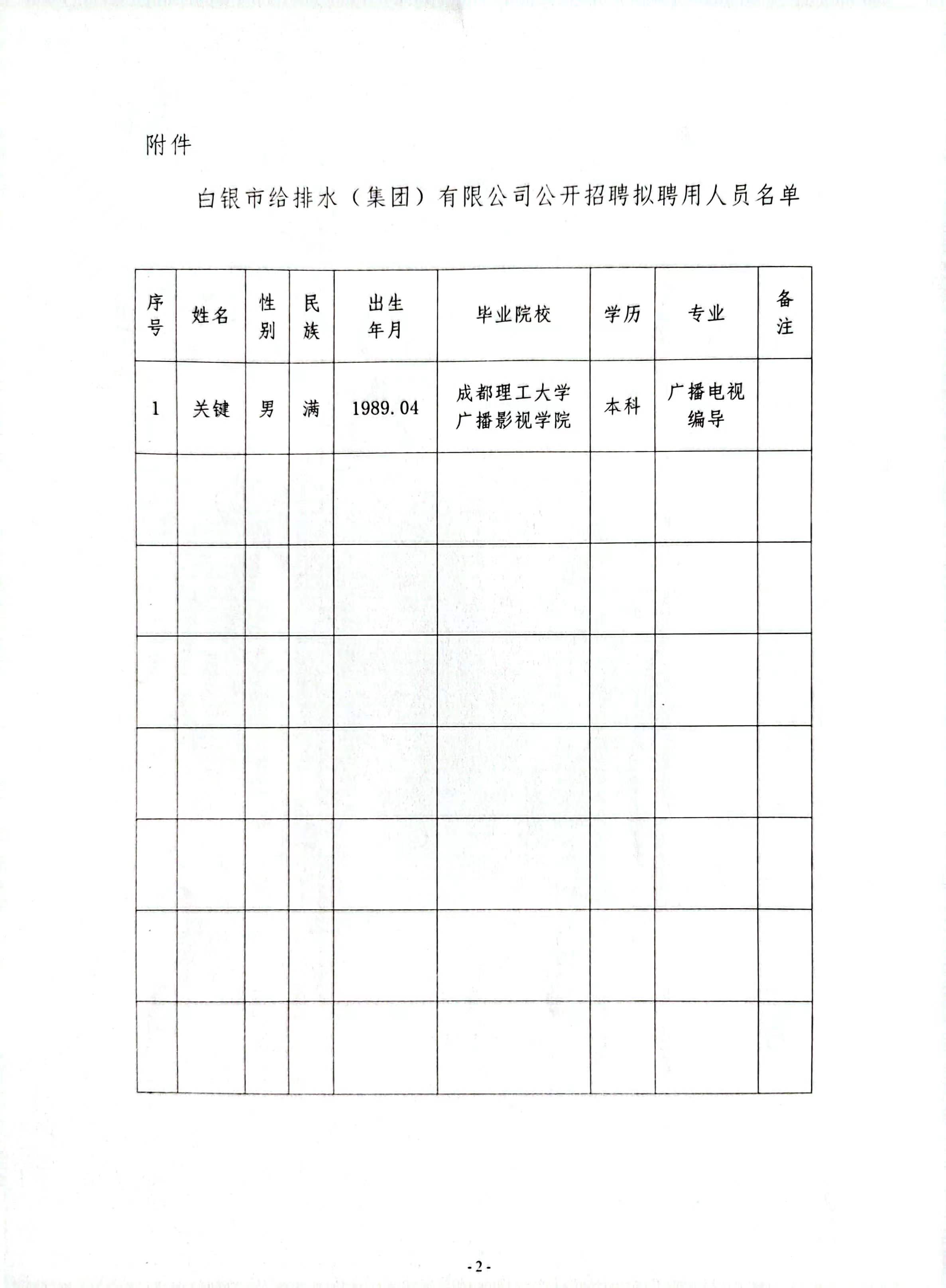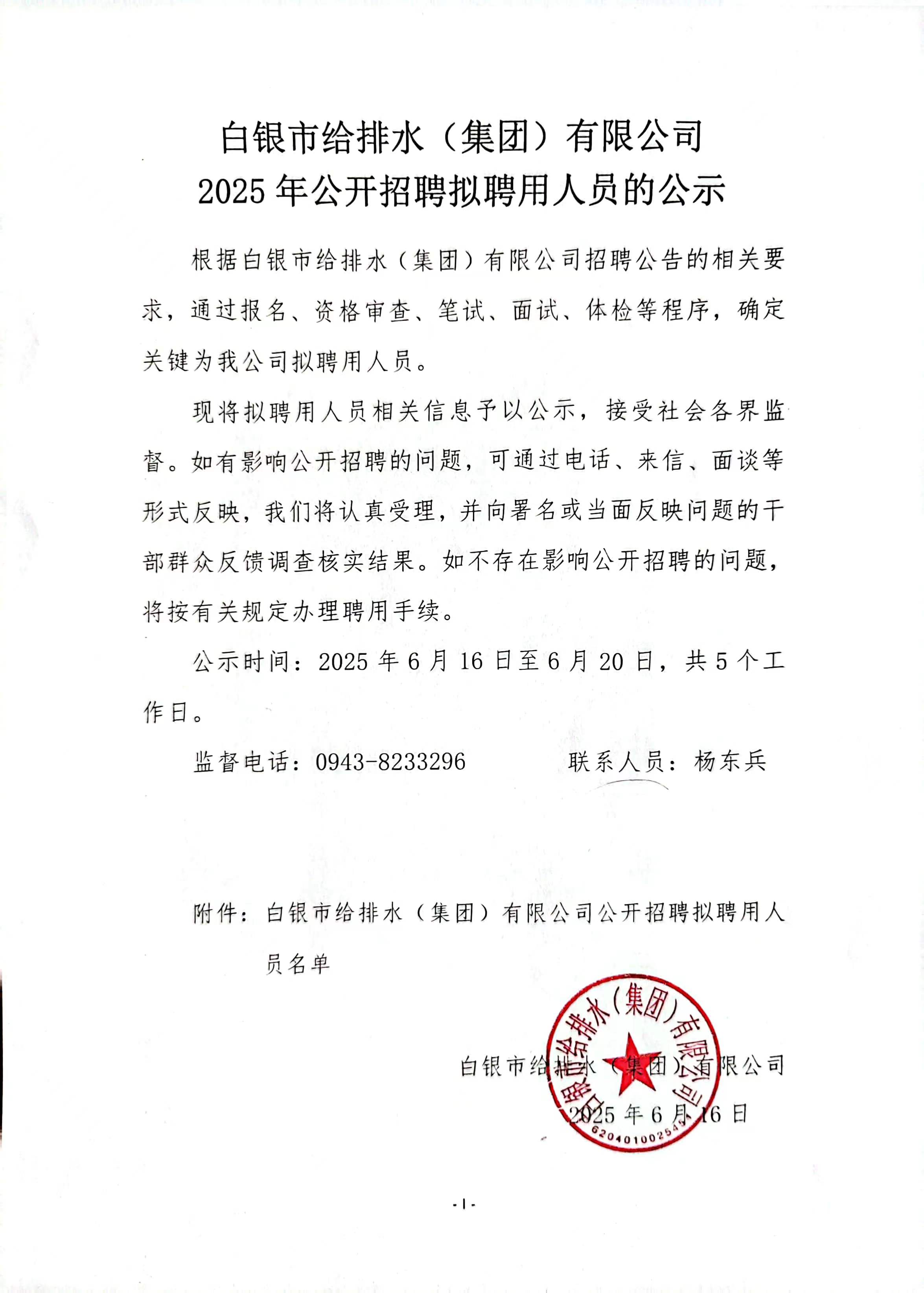 白銀市給排水(集團(tuán))有限公司2025年公開招聘擬聘用人員的公示